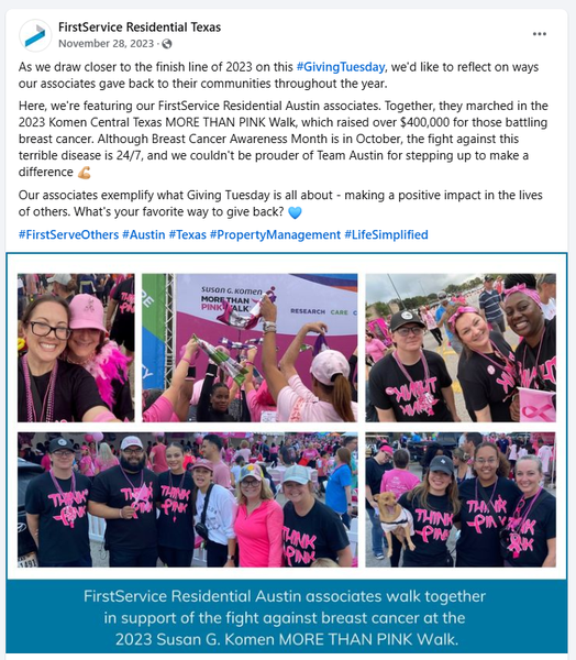Social Post - LI & FB • 11/28/2023 Austin Associates Walk Together in "More Than Pink" for Susan G. Komen